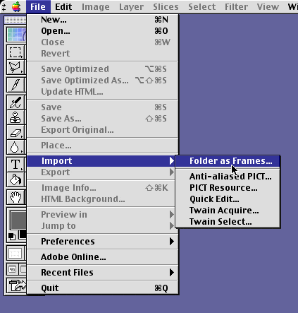 31. Launch Adobe® ImageReady and click File > Import > Folder as Frames.