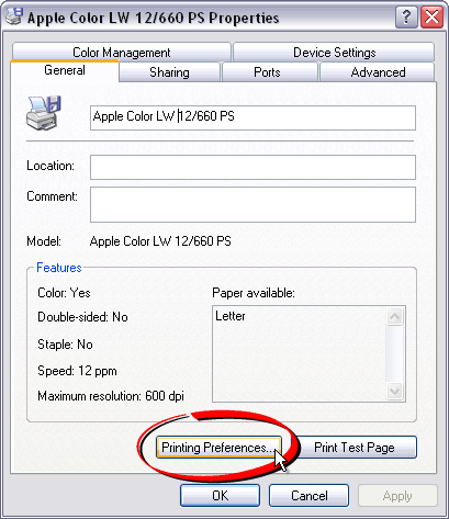 3. From the "General" tab, click the "Printing Preferences" button.