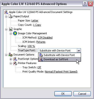 The printer is now configured to send TrueType fonts to the printer and