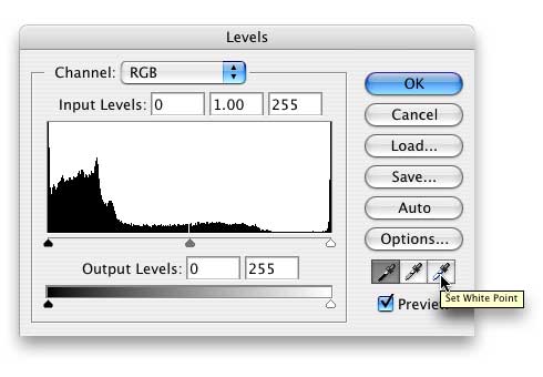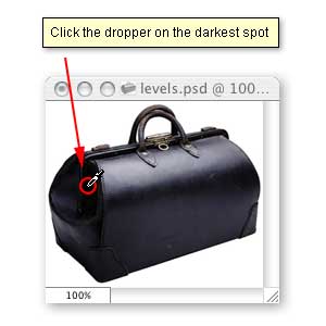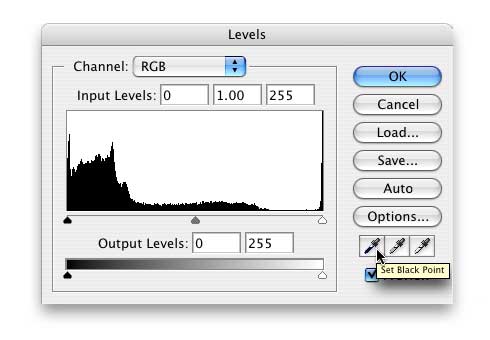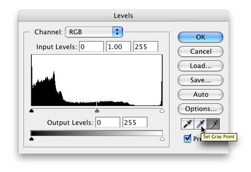 6. Now let's turn our attention to the Levels dialog box. As I mentioned earlier, you can use the Levels adjustment in a variety of ways. In this example, we will use the little dropper buttons in the lower right corner. Click the one on the left to set the black point.