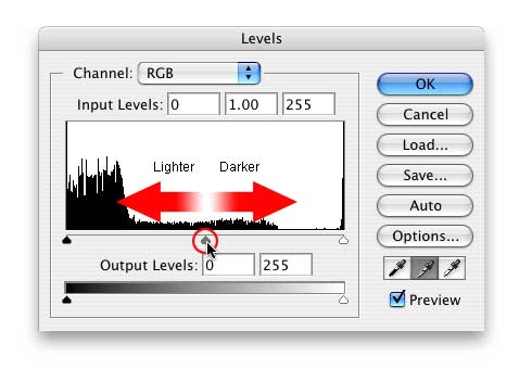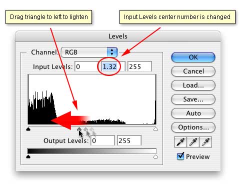 13. Drag this triangle to the left just slightly. Make sure the Preview checkbox is checked so you can see the effect of this adjustment as you make it. After you make the adjustment, you will see a change in the center box of the Input Levels just above the histogram.