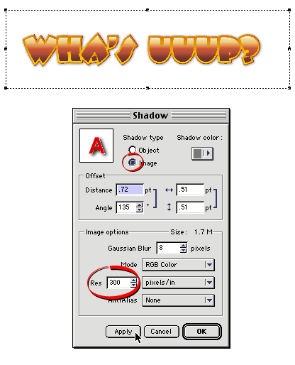 21. For a finishing touch we can add a soft shadow. Canvas has a built-in effect for this. Click Effects > Shadow... and use the settings shown in the dialog,below. Choose "Image" for the shadow type and 300 ppi for the resolution (circled below). When you click "Apply", Canvas creates a new shadow paint object underneath the text object.