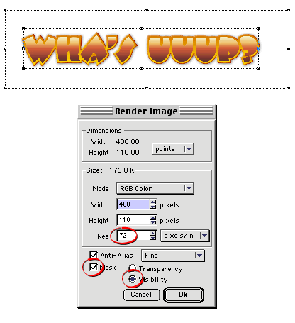 23. Although the text effect can be rendered at 300 ppi for print, you can also render it at 72 ppi for screen displays. Simply select the text and shadow objects and click Image > Area > Render or click File > Save As then save the selection to one of the bitmap formats (TIFF, PSD, BMP, PICT, etc.). Either command will bring up the "Render Image" dialog. We want a 72 ppi image with a visibility mask.